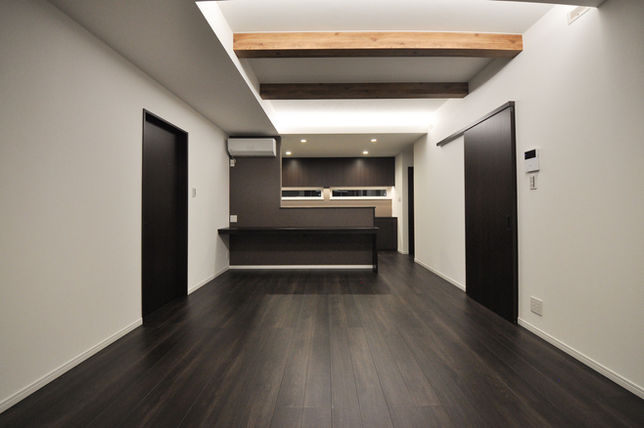 外観は黒を基調に木調をあしらい、スタイリッシュで温かみのある印象に。屋根は南側に勾配を持たせ、将来的な太陽光パネルの設置も視野に入れた設計としています。